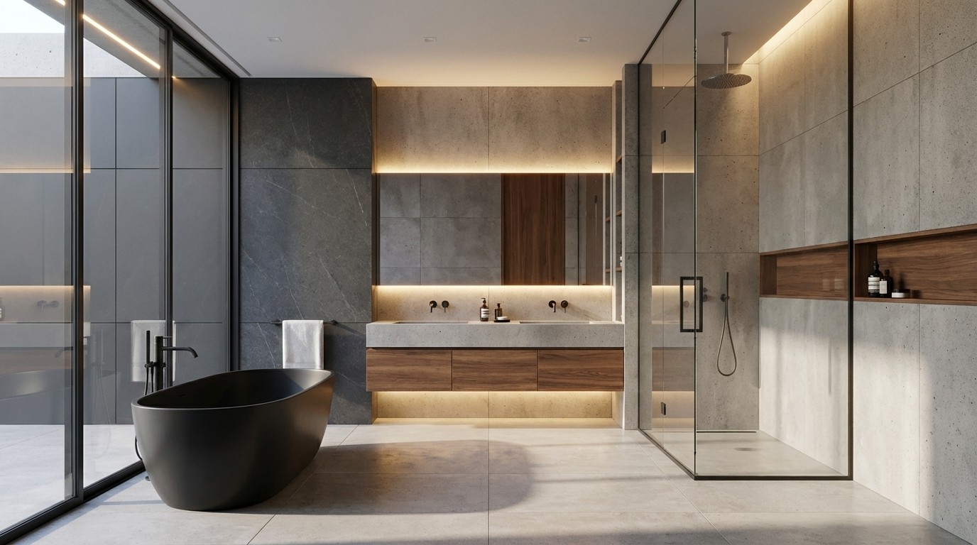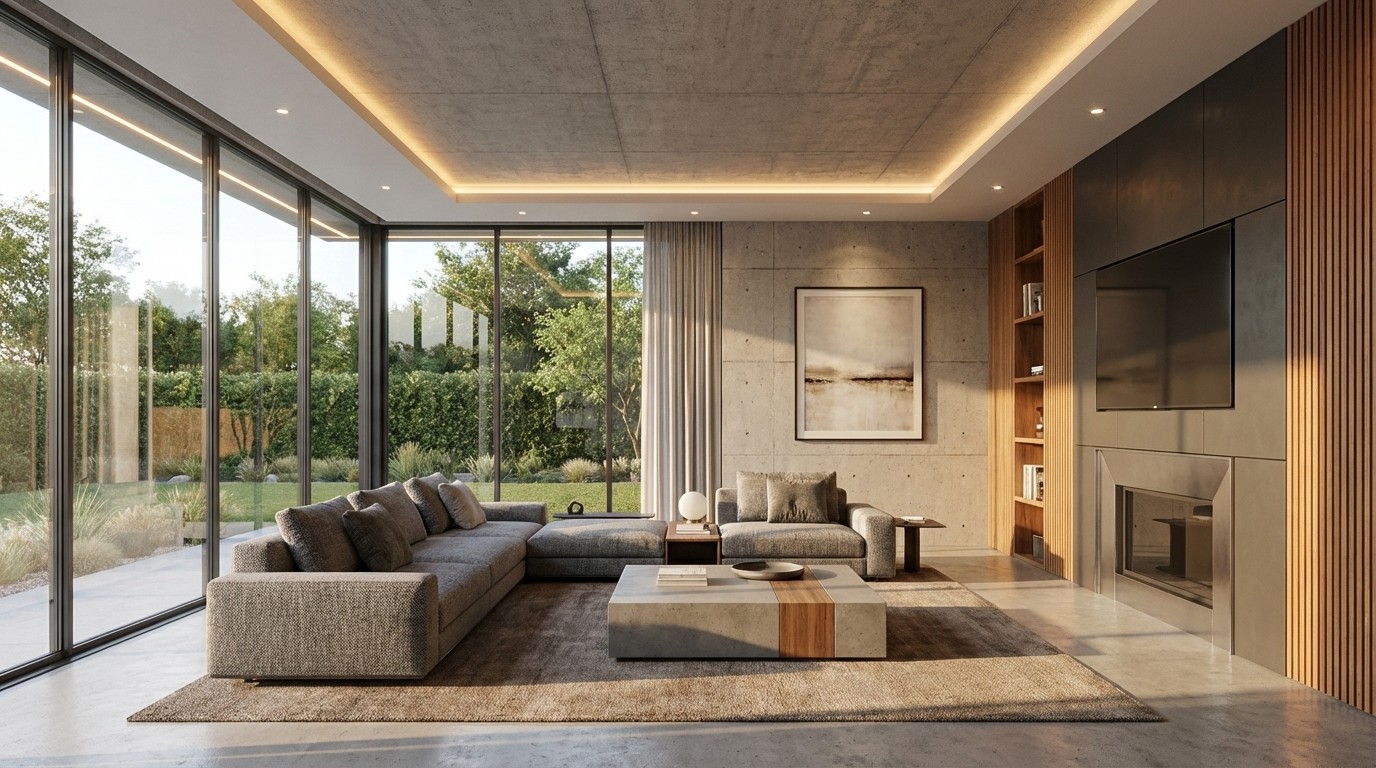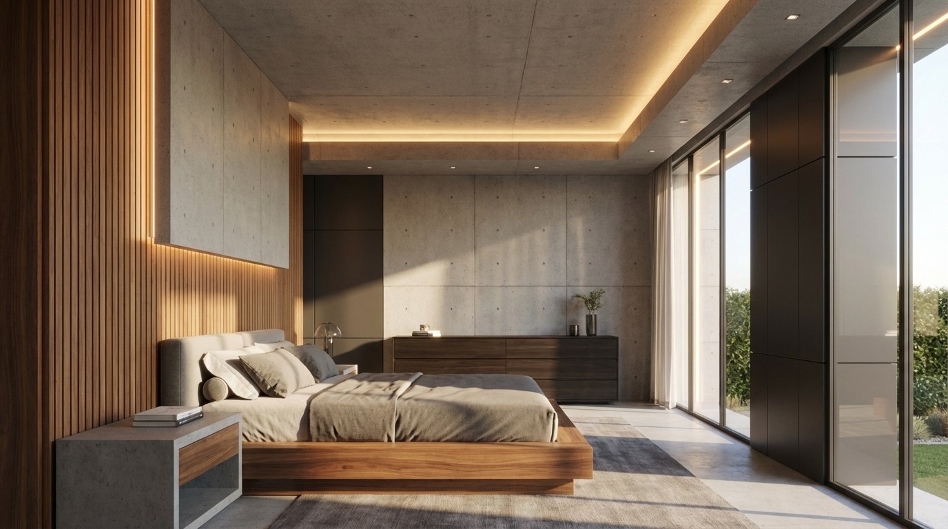 A refined material palette combines raw architectural concrete with warm vertical timber siding and dark composite panels to create textural depth. Integrated LED strip lighting accentuates the building’s geometric outlines, while frameless glass balustrades ensure an unobstructed connection with the manicured surroundings.